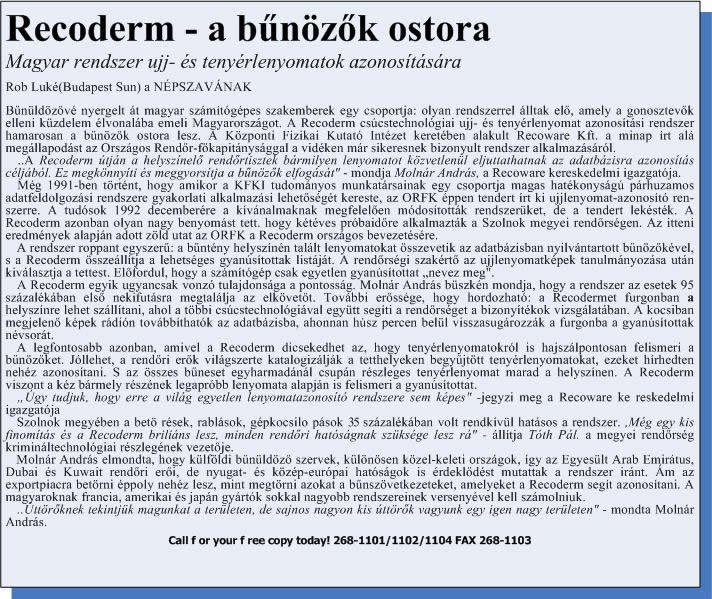 The RECOderm system had been applied by the Hungarian Police since 1992; based in the one-year experience in the practice they decided on the countrywide introduction of the system. Upon its operation, the system justified the expectations.